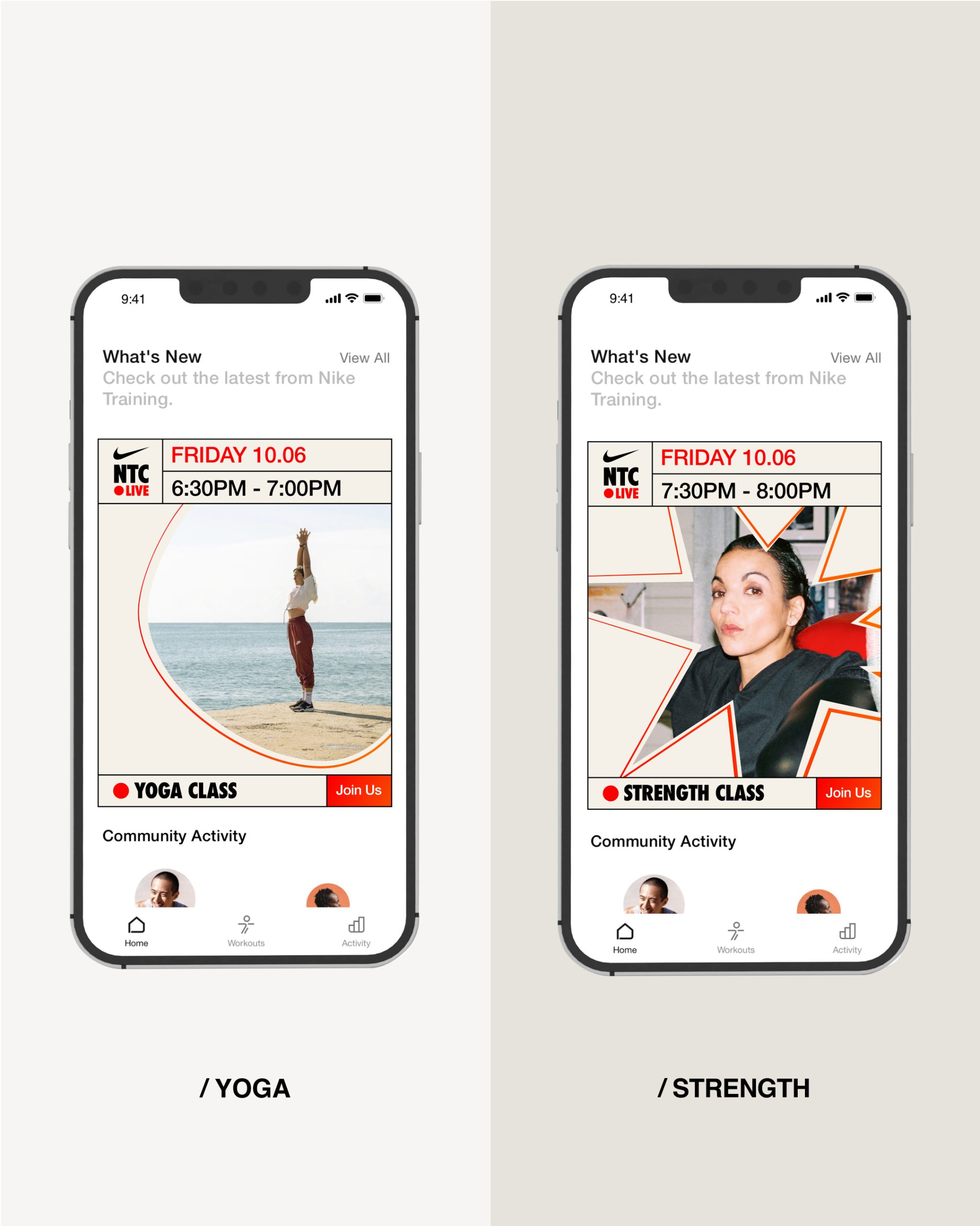 Nike Training Club Live is a global experience that lets people tap into their favorite workouts and find the motivation and inspiration to move, connect, and evolve together. The identity system empowers Nike Training Club Live to connect with its community and inspire people to train together, wherever they are.